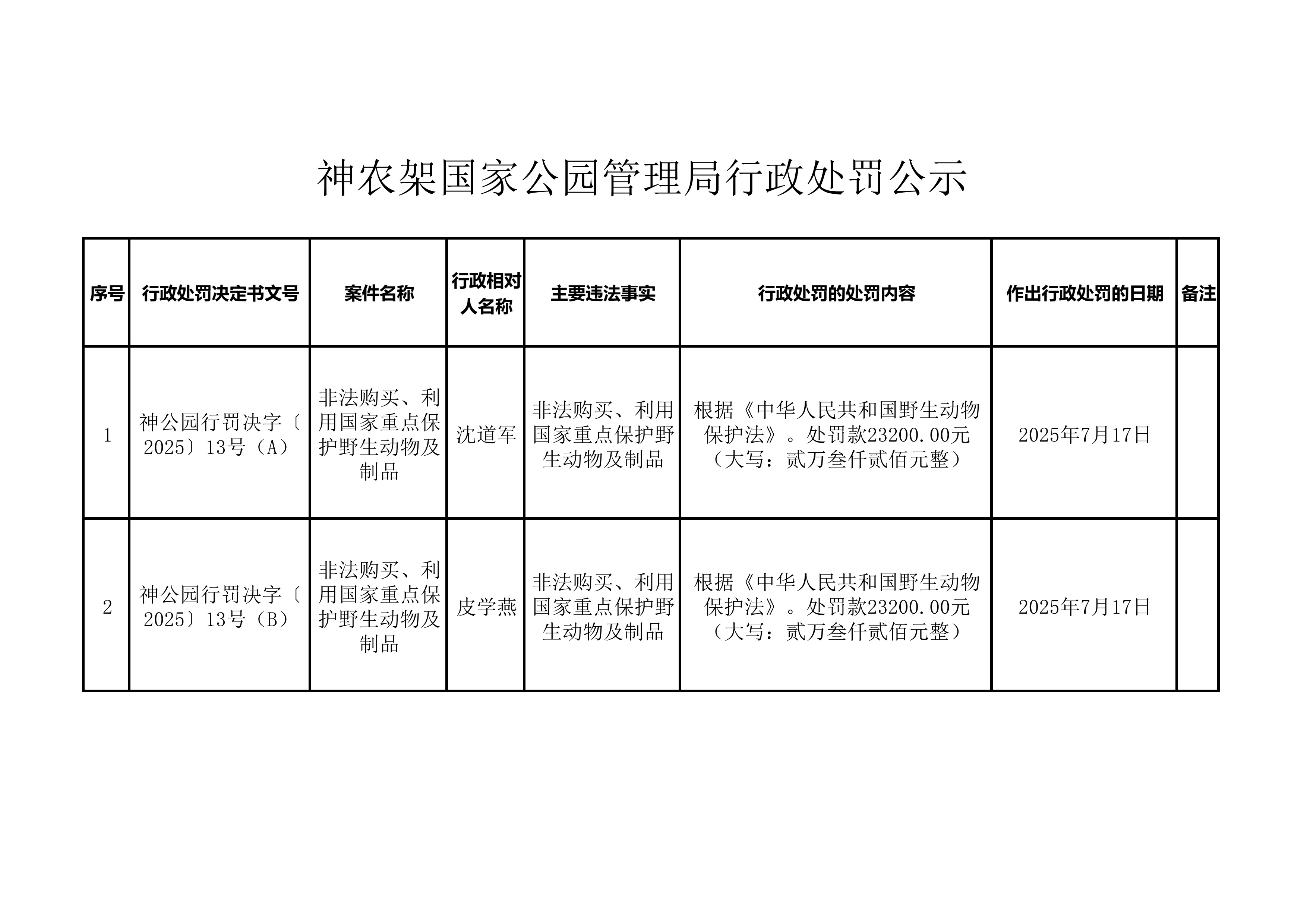神農(nóng)架?chē)?guó)家公園管理局行政處罰公示